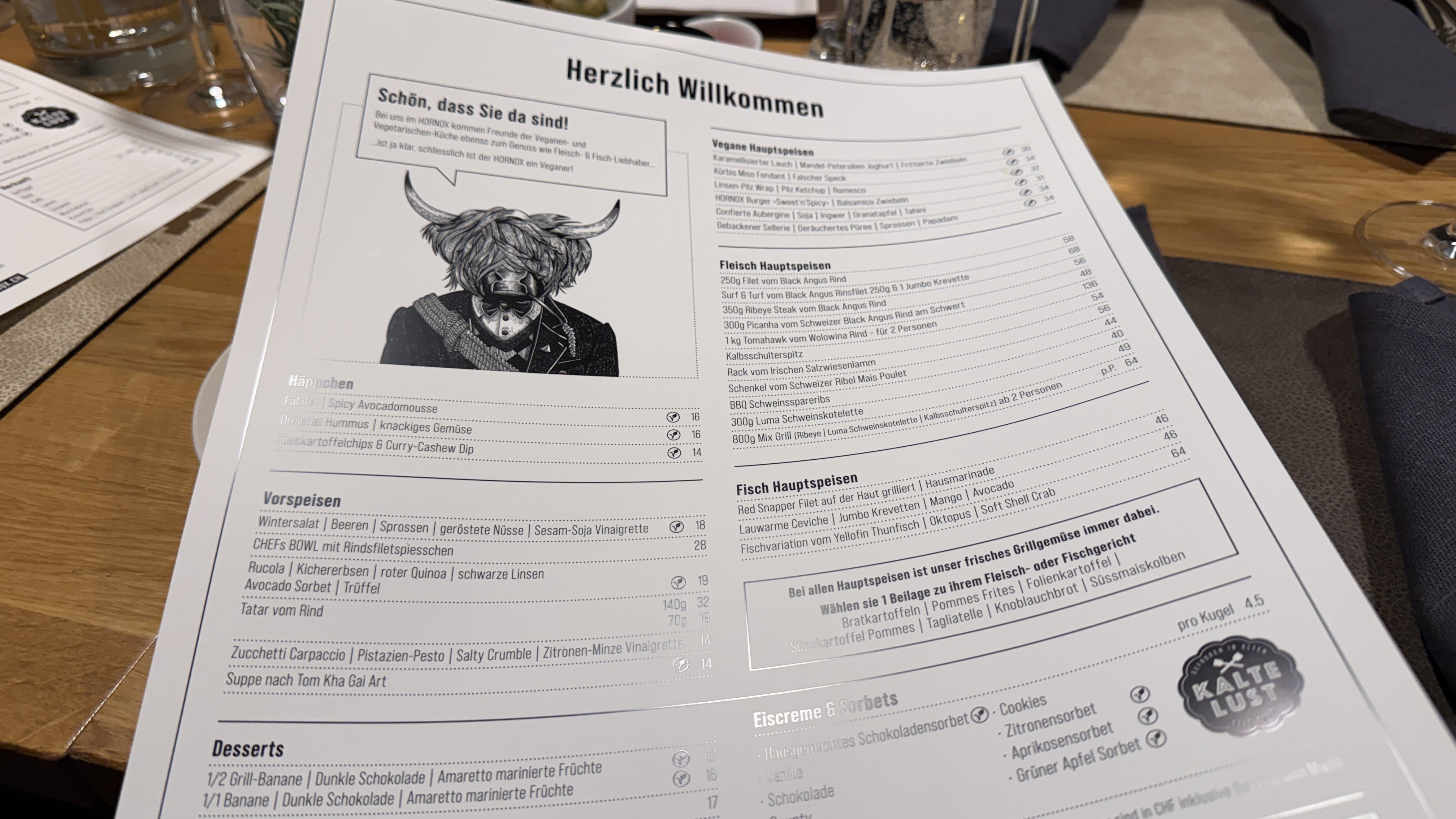 Das Grillrestaurant Hornox befindet sich im unteren Teil des Dorfes. Bequem zu Fuss ab Bahnhof Zermatt und gut erreichbar. Der Besuch im Hornox beginnt mit einem stimmigen Gesamteindruck. Der Raum ist warm ausgeleuchtet, Holz dominiert, die Tische sind sauber gedeckt, mit Stoffservietten und schlichtem Besteck.
