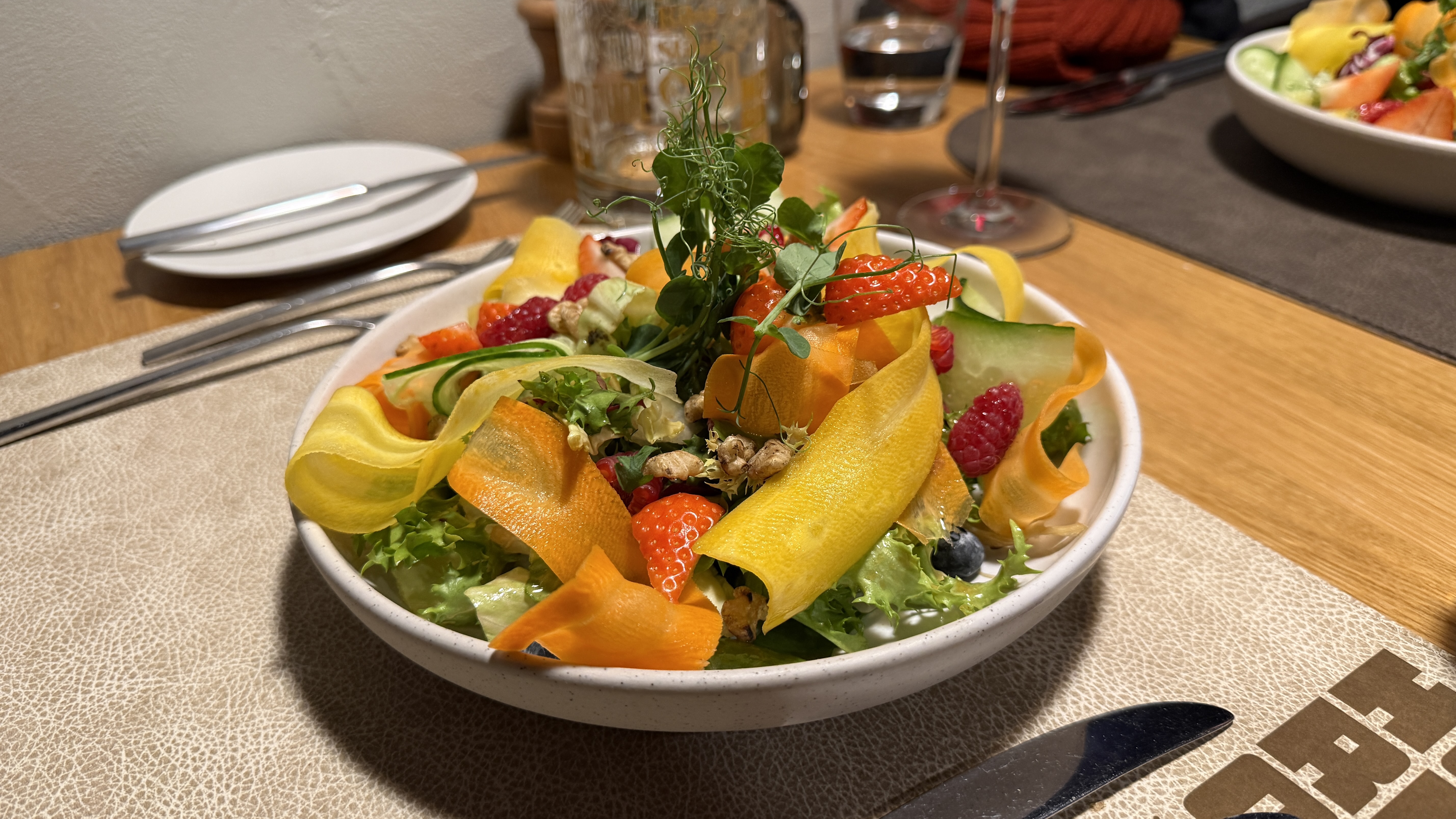 Kulinarisch startete der Abend mit einem Vorspeisensalat. Dieser ist farbig, frisch und sorgfältig angerichtet. Karotten und Gurken sind fein gehobelt, Beeren setzen süsse Akzente, Nüsse sorgen für Textur. Optisch wirkt der Teller ausgewogen und einladend, geschmacklich solide.